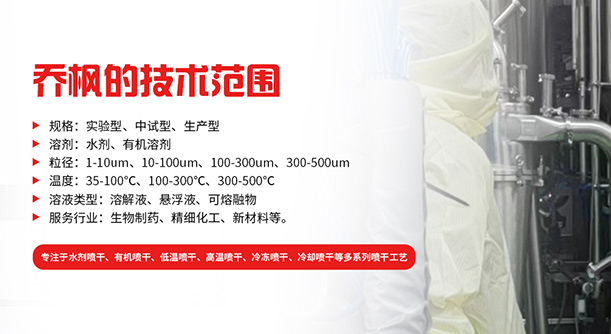 上海喬楓實業(yè)有限公司,成立于2012年,是從事噴霧干燥設(shè)備的研發(fā)設(shè)計、生產(chǎn)、銷售(小型噴霧干燥機,實驗型噴霧干燥機,35℃低溫噴霧干燥機,有機溶劑噴霧干燥機,低溫閉式循環(huán)噴霧干燥機、超細(xì)粉末噴霧干燥機、噴霧冷凍干燥機、真空噴霧干燥機、氣流噴霧干燥機,噴霧造粒干燥機,離心噴霧干燥機,沸騰制粒機等)和售后于一體的綜合性公司,本公司現(xiàn)成為一家致力于為生物制藥、精細(xì)化工、新能源、陶瓷造粒及食品工程等領(lǐng)域提供全套解決方案的整線交鑰匙工程企業(yè)。